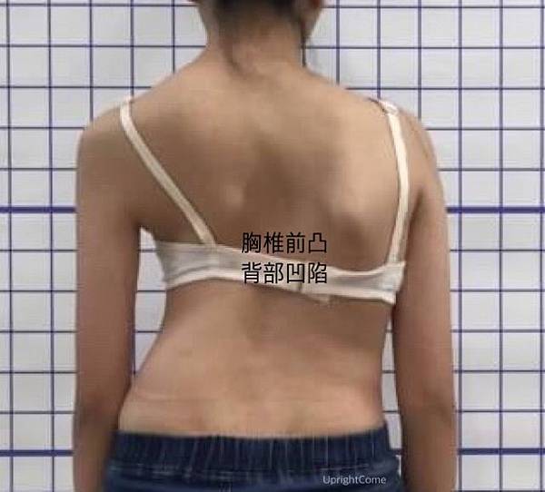 - 側面脊柱生理曲線異常。正常的側面脊柱曲線是胸椎後凸與腰前彎,在中重度以上的脊柱側彎案例,更容易出現脊柱僵直與生理曲線不足的情形,最典型的外觀是,倆肩胛骨中間有個凹洞與塌陷(如下圖),產生胸椎前凸背部凹陷的情形。這也是治療時很困難的部分之一,身體異常的凹陷,內臟空間相對受限,這樣的警訊也常常被患者忽略,因爲患者多著眼於凸起的部位。