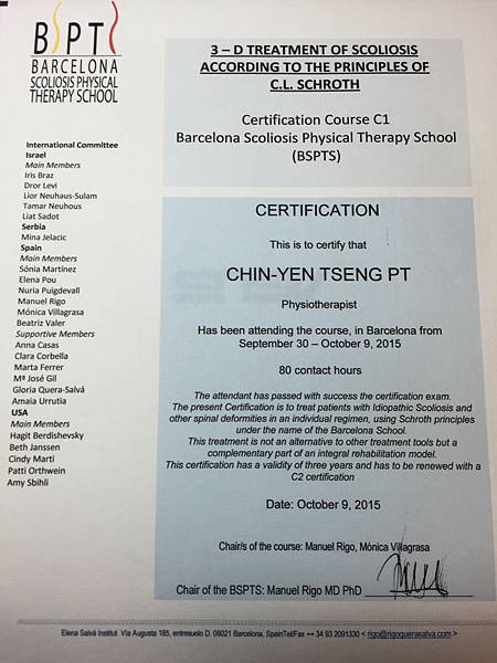 每年持續進修,2017年至荷蘭進修BSPTS高階脊柱側彎治療受訓與認證,由BSPTS創辦人Dr.Rigo親自授課與臨床治療,經過嚴苛的受訓與臨床考核,順利通過並取得BSPTS高階治療證書。